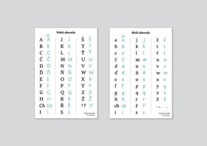 Praktická pomůcka s psací abecedou "Comenia Script universal" v kombinaci s tištěnou abecedou.
