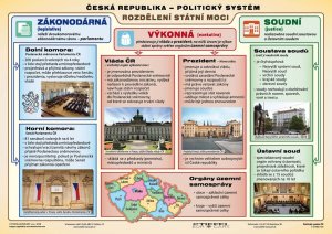 Oboustranná naučná tabulky se na přední straně zaměřuje na přehledné znázornění politického systému a rozdělení státní moci v ČR, formu realizace a její institucionální zakotvení ve státě.