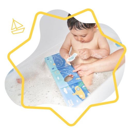 sada obsahuje: rozkládací knížku/leporelo + prstového maňáska + 20ks pěnových puzzle, které plavou na vodě a drží na stěnách vany či sprchového koutu