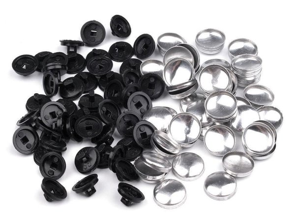 Knoflík na potahování se skládá ze dvou částí - kovové a plastové. K potažení můžete zvolit různé materiály. Potažené knoflíky skvěle ozdobí vaše halenky, šaty, saka apod. [Na látku doporučujeme použít výsečník, který najdete pod kódem 750973.]