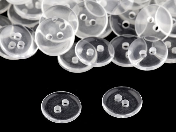 Transparentní dvoudírkové knoflíky jsou vhodné jako zapínání na košile, svetry, šaty i polštáře. Dají se použít také jako protikus. Mají kulatý tvar. [Knoflíky jsou baleny v sáčku.] Velikost knoflíků naleznete v této tabulce.