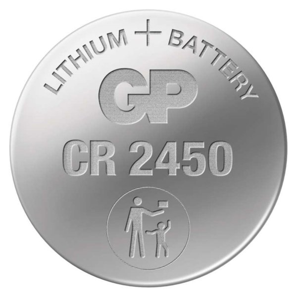 Baterie řady GP Lithium Chemické složení: lithiové Typ: GP CR2450 Napětí: 3 V Kapacita: 590 mAh Rozměr: 24,5 × 5,0 mm Hmotnost: 6,6 g Provozní teplota: -20 °C až +60 °C Prodejní obal: 5 ks, blistr