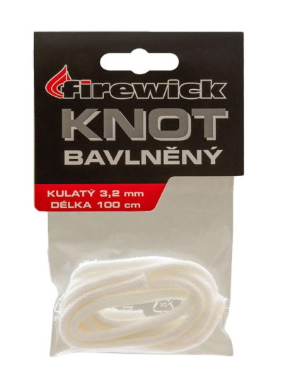 Knot lampový FIREWICK. Kulaté bavlněné knoty se používají dle použitého průměru do všech typů lamp, včetně lamp petrolejových a zahradních pochodní. Rozměry: průměr 3,2 mm, délka 100 cm. Barva: béžová.
