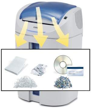 Profesionální skartovač určený pro osobní použití a malé kanceláře nabízí unikátní řešení se dvěma nezávislými systémy řezání. První systém je optimalizován pro papírové dokumenty s kapacitou až 19 listů současně, druhý specializovaný systém je určen pro bezpečné skartování CD, DVD a platebních karet včetně karet s čipem.
