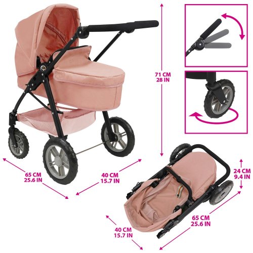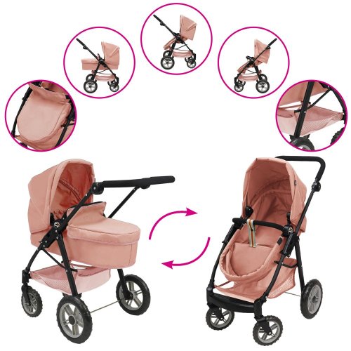 509 Crew kočárek pro panenky 2v1 • Rozměry výrobku cca 64 x 41 x 68 cm • Luxusní kočárek s odnímatelným sedátkem 2v1 • Sedadlo kočárku lze přeměnit na kočárek pro panenky • Dodává se se stříškou a krytem botičky • Nastavitelná rukojeť • Otočné přední kolo • Velký košík • Vhodné pro panenky do cca 53 cm