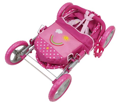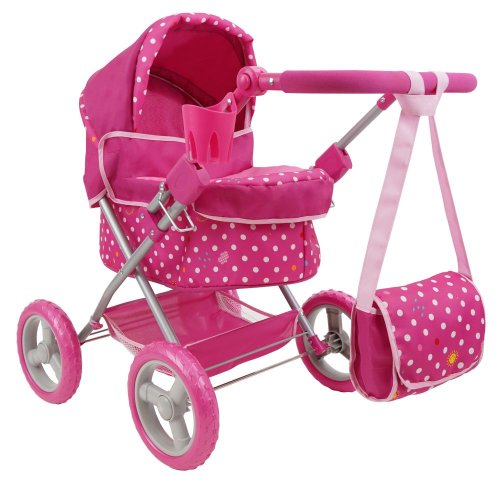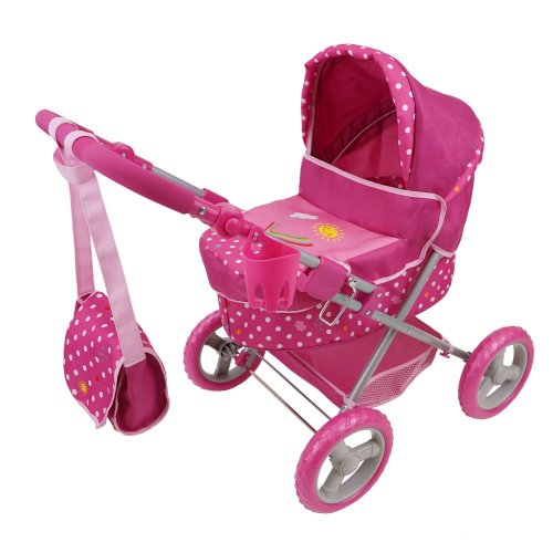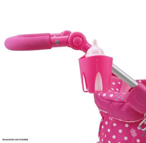 Kočárek je vhodný pro panenky do cca. 46 cm. Pro děti od 3 let. • Nastavitelná výška rukojeti je cca. 43 - 67 cm • Skládací rám kočárku pro snadné skladování • Měkká pěnová rukojeť • Obsahuje držák na nápoj a nákupní košík • Dodává se s přebalovací taškou stejného vzoru • Zatahovací stříška