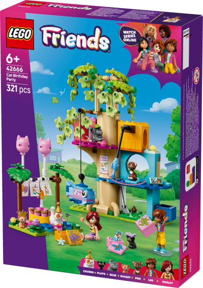 Stavebnice LEGO® Friends Kočičí narozeninová oslava a dům na stromě pro holky a kluky od 6 let obsahuje 2 minipanenky a 5 figurek koček pro kreativní hraní Děti si užijí spoustu zábavy při hraní s 5 kočkami v kočičím domku na stromě, ve kterém najdou piñatu ve tvaru ryby s pamlsky uvnitř, kočičí hračku, kočičí trávu a fontánu Tato stavebnice obsahuje minipanenky Lea a Paisley, 5 figurek koček, sestavitelný kočičí domek na stromě a sestavitelný narozeninový dort Děti se pustí do vymýšlení nekonečných zábavných příběhů s doplňky, mezi nimiž nechybí narozeninový dort se svíčkou, dárky, girlandy, balónky ve tvaru kočky, narozeninová čepička a kočičí pamlsky