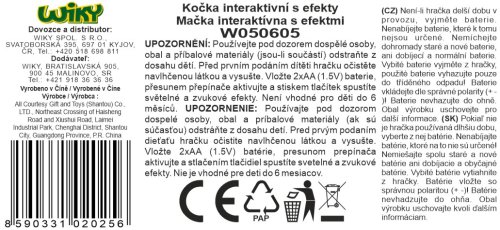 Kočka interaktivní s efekty. Velikost 16 cm. 2xAA baterie součástí balení. Vydává světelné a zvukové efekty. Funkce automatického vypnutí. Přepínač na vypnutí a dvě úrovně hlasitosti.
