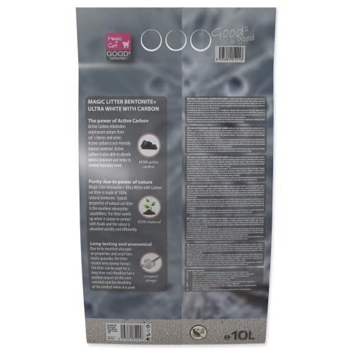Stelivo pro kočky superprémiové kvality s aktivním uhlím. Je vyrobeno z vysoce kvalitního, jemnozrnného bentonitu, tudíž má vynikající absorpční schopnosti.
