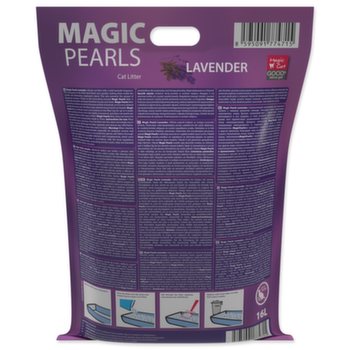 Silikátové stelivo pro kočky s jemnou vůní levandule. Díky mikropórům na sebe stelivo velice rychle váže tekutiny, které uzamkne uvnitř krystalků a eliminuje nepříjemný zápach. Tím zabraňuje množení nebezpečných bakterií. Díky tomuto inovativnímu procesu má stelivo Magic Pearls extrémní savost a udržuje toaletu suchou a čistou. Stelivo Magic Pearls je bezprašné a neulpívá na tlapkách a srsti zvířat, takže není kočkami vynášeno mimo toaletu. Stelivo je vhodné i pro dlouhosrstá plemena koček. Stelivo Magic Pearls v toaletě vydrží absorbovat pachy a vlhkost až 4 týdny (při použití jednou kočkou), proto je jeho použití také velice ekonomické, není třeba jej měnit tak často jako jiné druhy steliv.