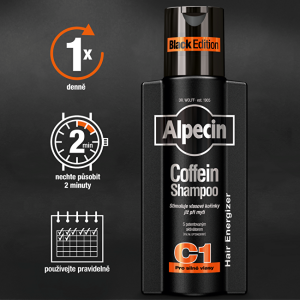 Alpecin Coffein Shampoo C1 v novém cool černém designu a s novou vůní. Jeho patentovaný aktivátor pomáhá předcházet dědičnému vypadávání vlasů a posiluje je. Stimuluje vlasové kořínky již při mytí. Šampon je bez silikonů.