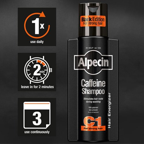 Alpecin Coffein Shampoo C1 v novém cool černém designu a s novou vůní. Jeho patentovaný aktivátor pomáhá předcházet dědičnému vypadávání vlasů a posiluje je. Stimuluje vlasové kořínky již při mytí. Šampon je bez silikonů.
