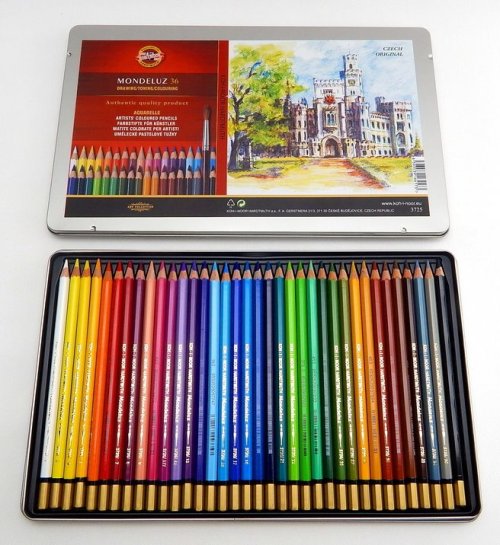 Umělecká souprava akvarelových pastelek v plechovém pouzdře. Vynikají světlostálostí, čistotou barev a barevnou škálou čítající až 72 různých barevných odstínů. Při aplikaci štětce a vody lze jejich stopu zcela rozmalovat a následně aplikovat techniku akvarelové kresby. Balení obsahuje 36 pastelek.