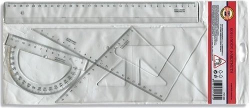 Souprava geometrická velká pro leváky se skládá z výrobků: trojúhelník 45/177 s kolmicí, trojúhelník 60/250, pravítko 30 cm a úhloměr 180/125. Všechny výrobky jsou vyrobeny z čirého průhledného polystyrenu. Stupnice jsou zhotoveny technologií přesného sítotisku, který je při běžném používání odolný proti opotřebení. Přesnost délkových stupnic 0,2% délky. Souprava je vhodná pro technické kreslení, rýsování a měření přímek, úseček, rovnoběžek, kolmic, úhlů, apod. ve škole i v kanceláři. Zásadní rozdíl oproti standardu spočívá v otočení všech stupnic. Stupnice mají začátek na pravé straně a číslovány jsou od pravé strany do leva. Tím jsou výrobky předurčeny pro leváky. Výrobky jsou zabaleny do polotransparentního polypropylenového pouzdra s potištěnou papírovou vložkou a eurozávěsem. Na papírové vložce je natištěn hologram pro levoruké.