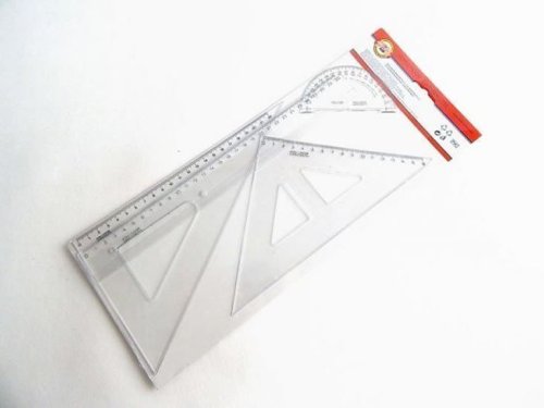 Souprava geometrická velká se skládá z výrobků: trojúhelník 45/177 s kolmicí, trojúhelník 60/250, pravítko 30 cm a úhloměr 180/100.