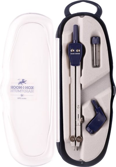 Školní kovové kružítko určené k rýsování kružnic do průměru 360 mm s upínacím průměrem 3,5 mm včetně tuženky s 2 náhradními tuhami a univerzálního nástavce (adaptéru) v krabičce z tvrdého plastu.