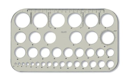 Kružnicová šablona vyrobená z kouřovéko průhledného polystyrenu. Je předurčena ke kreslení kružnic o průměrech 4 až 40 mm po 1 mm pomocí ohrocené tužky, mikrotužky, versatilky nebo technických per. Všechny kruhové otvory jsou označeny natištěnou číslicí s příslušným průměrem a osovým křížem. Dále jsou na šabloně natištěny: délková stupnice o délce 200 mm, úhloměrná stupnice 0 – 360°(á 5°), 2x úhloměrná stupnice 0 – 40°(á 1°) a stupnice pro rovnoběžky. Tisk je proveden technologií přesného sítotisku a při běžném používání je odolný proti opotřebení. Šablona je určena k rýsování a technickému kreslení ve škole i v kanceláři. Zabalena je do pelyetylenového sáčku s eurozávěsem.