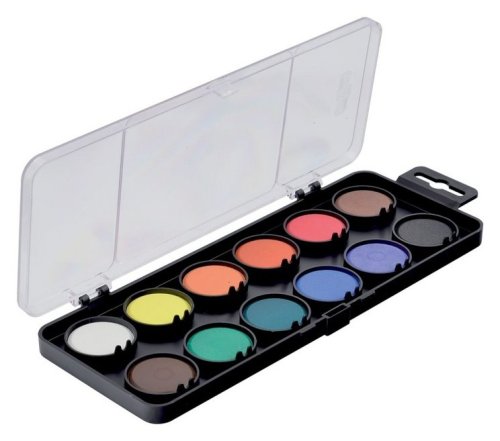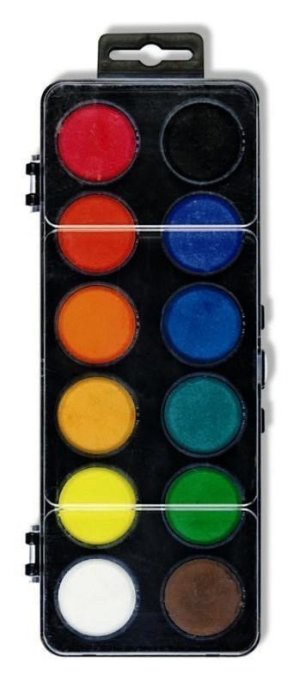 Školní vodové barvy 12ti odstínů s tabletami o průměru 3 cm v obdélníkových, plastových, jednopatrových barevnících s transparentním víčkem. Barvy jsou výrazné, vyznačují se svým vysokým obsahem pigmentů. Jsou certifikované a zcela bezpečné pro děti.