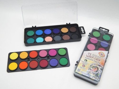 Školní vodové barvy 24 odstínů s tabletami o průměru 30 mm v obdélníkových, dvoupatrových, plastových barevnících s papírovou vložkou. Barvy jsou řazeny ve dvou patrech po 12ti odstínech, mají vysoký obsah pigmentu. Jsou certifikované a zcela bezpečné pro děti.