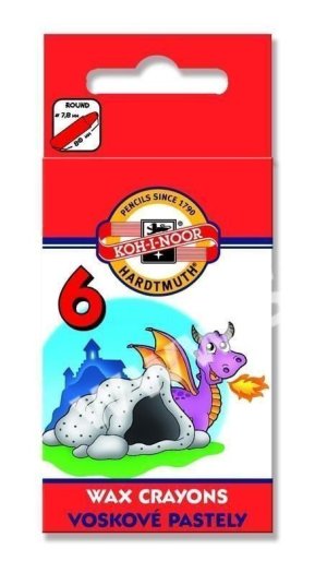 souprava voskovek určených pro školní, aranžérské a umělecké kreslení – 6 ks souprava. Souprava 6 kusů kulatých voskovek se zašpičatělým koncem o rozměrech O 7,8 mm, délka 80 mm, kde každá voskovka je obalená zavinovacím štítkem modro-bíle pruhovaným se žlutým textem WAX CRAYON. Voskovky jsou vložené hroty k eurozávěsu, do kartonové potištěné krabičky s motivem draka. Rozměr krabičky 113 x 51 x 9 mm. S ohledem na duševní a fyzické schopností dítěte může být výrobek vkládán do úst a ukousnut/odlomen. Dítě ukousnutou/odlomenou část spolkne. Spolknutá část projde trávicím traktem bez zjevného ovlivnění traktu.