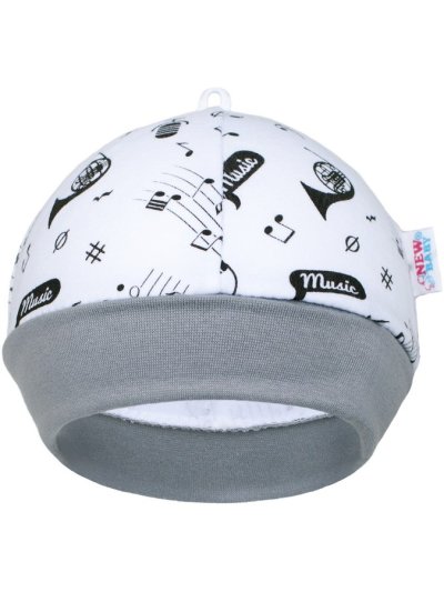 Bavlněná kojenecká čepička New Baby Music pro miminka. Čepička má široký pružný lem, který krásně kryje oušká a netlačí. Čepičku zdobí potisk notiček a hudebních nástrojů. Měkký, příjemný a velmi kvalitní materiál zaručí spokojenost Vašeho dítěte. Naše hravá čepička je vhodná pro kluky i holčičky. Složení: 100% bavlna. Obvod kolem hlavičky cca 30 cm.
