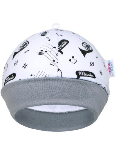 Bavlněná kojenecká čepička New Baby Music pro miminka. Čepička má široký pružný lem, který krásně kryje oušká a netlačí. Čepičku zdobí potisk notiček a hudebních nástrojů. Měkký, příjemný a velmi kvalitní materiál zaručí spokojenost Vašeho dítěte. Naše hravá čepička je vhodná pro kluky i holčičky. Složení: 100% bavlna. Obvod kolem hlavičky cca 33 cm.