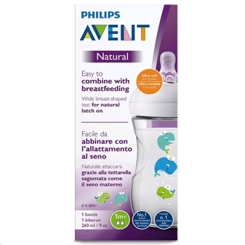Dětská láhev AVENT Natural velryba s dudlíkem. Široký dudlík ve tvaru prsu usnadňuje dítěti kombinovat kojení a krmení z láhve. Tvar okvětních lístků v dudlíku zvyšuje měkkost a pružnost, aniž by došlo k jeho stlačení. Dudlík má 2 otvory-pomalý až střední průtok. Těsně přiléhající víčko zabraňuje vylévání obsahu lahvičky a není tedy třeba použít těsnící víčka. Inovativní dvouventilový systém snižuje riziko koliky a nepohodlí tím, že vzduch proudí do lahve a nikoli do bříška dítěte. Láhev neobsahuje BPA (Bisfenol A). Ergonomický tvar láhve umožňuje jednoduché držení i pro malé dětské ručky. Balení obsahuje dudlík a průhledné víčko. Určeno pro děti od 1m+. Obsah 260 ml.