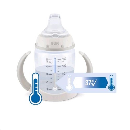 Kojenecká láhev na učení NUK First Choice s kontrolou teploty. Zabudovaný indikátor kontroly teploty změní barvu, pokud je obsah lahvičky příliš horký. Modrá barva indikátoru se změní na bílou. Lahvička miminkům usnadňuje přechod od kojení nebo krmení k samostatnému pití. Kojenecká láhev má měkké silikonové nekapající pítko a nemusíte se bát vylití obsahu. Je ergonomicky tvarovaná a má protiskluzová držátka, takže si dítě může láhev držet samo například i při jízdě v kočárku. Výhodou této super lahvičky je, že se snadno rozmontujete a čistí. Vyrobená z vysoko kvalitného plastu polypropylénu a neobsahuje BPA (Bisfenol A). Vhodné pro děti od 6 do 18 měsíců. Klinicky testováno. Balení obsahuje: <BR>- lahvička s pítkem 150 ml<BR>- šroubovací kroužek<BR>- těsnící víčko a ochranný kryt<BR>- silikonové pítko, které zabraňuje vylití<BR>- indikátor teploty