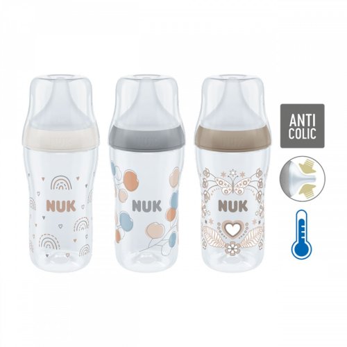 Kojenecká láhev NUK Perfect Match s kontrolou teploty a měkkou silikonovou savičkou. Speciální tvar typický pro savičky NUK s ortodontickou antikolikovou savičkou je modelován podle mateřské bradavky při kojení. Ponechává dostatek prostoru pro přirozené sací pohyby jazyka i čelisti. Velká, široká opora rtů při pití připomíná matčinu pokožku. Lahvička je navržena tak, aby miminko nepřišlo do kontaktu s pevnými plastovými částmi. Vylepšený systém proti polykání vzduchu při pití Anti Colic Air System zajišťuje přirozený tok mléka, aby dítě pilo uvolněně bez polykání vzduchu. Hladce se zužující tvar s antikolikovou funkcí pro plynulý a nerušený průtok pití, velikost M (od 3 m, pro mateřské mléko). Kojenecké láhve jsou nyní vybaveny novou NUK kontrolkou teploty a pomáhají tak zabránit tomu, aby vaše dítě pilo příliš horký příkrm. Kontrolka vypadá jako teploměr, je umístěna mezi ryskami a teplota obsahu láhve změní její barvu. Pokud je příkrm příliš horký, modrá kontrolka se změní na bílou. V ideálním případě by měl příkrm mít tělesnou teplotu (37 °C), což odpovídá modrému zabarvení displeje. Vyrobena z vysoce kvalitního nerozbitného plastu polypropylenu a neobsahuje BPA (Bisfenol A). Obsah láhve 260 ml. Vhodná pro děti od 3 měsíců, M od 3 m pro mateřské mléko). Klinicky testováno.<BR>Charekteristika:<BR>- praktický displej NUK kontroly teploty, který změní teplotu z modré (studené) na<BR>bílou (příliš horké)<BR>- trvale hygienická láhev se vzhledem vysoce kvalitního plastu, příjemná na dotek<BR>- bez škodlivých látek a zápachu – neobsahuje BPA<BR>- bezpečné uchopení a stabilita – díky jemně vytvarované láhvi a široké základně<BR>- neomezený počet kombinací – lze kombinovat s veškerým příslušenstvím odsávaček mateřského mléka NUK Perfect Match a NUK Soft&Easy-nekapající-díky víčku láhev neteče a savička je chráněna před znečištěním. Kojenecké láhve jsou v souladu s evropskou normou EN14350.
