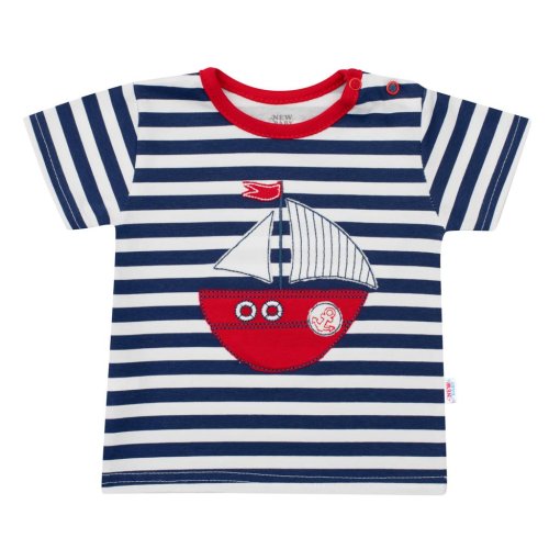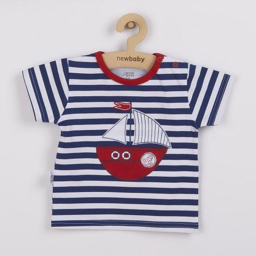 2-dílná letní bavlněná soupravička české značky New Baby Marine. Soupravička obsahuje tričko a kraťásky. Tričko s krátkým rukávem s barevným lemováním okolo krčku je zdobeno krásnou nášivkou lodičky a je celopotištěné modernimi pruhy. Nášivka je podlepená látkou proti poškrábání. Tričko má zapínání na ramínku pro snadné oblékání. Pohodlné kraťásky jsou jednobarevné s malým obrázkem kotvy. Složení 100% bavlna.