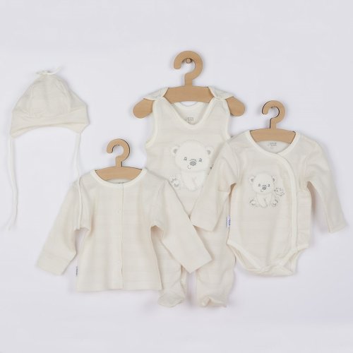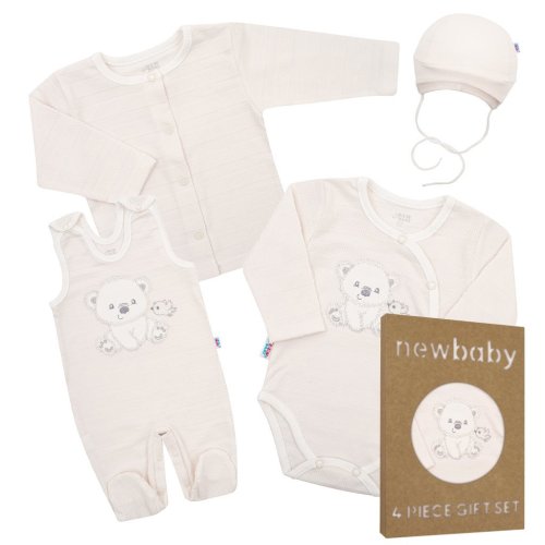 4-dílná soupravička české značky New Baby Sweet Bear pro miminka. Soupravička je vyrobena z kvalitního materiálu, který je vhodný pro miminka a je vhodná nejen do porodnice. Obsahuje celorozepínací body s dlouhým rukávkem, dupačky, kabátek a čepičku. Celorozepínací body zdobí vyšitý obrázek medvídka a ptáčka. Dupačky zdobí roztomilý obrázek medvídka a ptáčka. Zapínání na cvočky na ramínkách a mezi nožičkami. Kabátek je jednobarevný s krásným lemováním okolo ručiček. Zapínání je na cvočky po celé délce. Čepička je krásně tvarovaná na ouška a zavazuje se na tkaničky. Soupravička je v praktické Eko krabičce. Celá soupravička má nový neobyčejný design s atraktivním vzorem látky. Složení: 100% bavlna.