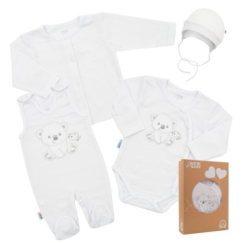 4-dílná soupravička české značky New Baby Sweet Bear pro miminka. Soupravička je vyrobena z kvalitního materiálu, který je vhodný pro miminka a je vhodná nejen do porodnice. Obsahuje celorozepínací body s dlouhým rukávkem, dupačky, kabátek a čepičku. Celorozepínací body zdobí vyšitý obrázek medvídka a ptáčka. Dupačky zdobí roztomilý obrázek medvídka a ptáčka. Zapínání na cvočky na ramínkách a mezi nožičkami. Kabátek je jednobarevný s krásným lemováním okolo ručiček. Zapínání je na cvočky po celé délce. Čepička je krásně tvarovaná na ouška a zavazuje se na tkaničky. Soupravička je v praktické Eko krabičce. Celá soupravička má nový neobyčejný design s atraktivním vzorem látky. Složení: 100% bavlna.