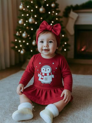 Krásné bavlněné kojenecké šatičky s čelenkou české značky New Baby Winter Penguin pro všechny malé parádnice. Šatičky s dlouhým rukávem v krásné červené barvě jsou zdobeny roztomilým a veselým tučňáčkem. Zapínání na cvoček na ramínku usnadní oblékání. Šaty mají velmi příjemný a kvalitní materiál, který je vhodný pro miminka. Krásná bavlněná dívčí čelenka, potěší všechny malé parádnice. Čelenka je pružná, dobře se přizpůsobí. Složení: 100% bavlna.