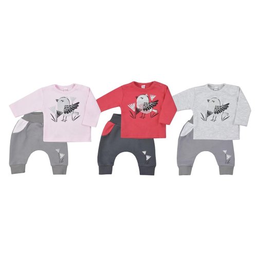 2-dílná bavlněná souprava Koala Birdy. Součástí soupravičky jsou tepláčky a tričko. Tepláčky mají moderní střih se sníženým sedem, který jim dodává ten správný šmrc, jsou zdobené obrázkem a ukončené širokým pružným lemem. Tričko je zdobené roztomilým obrázkem. Praktické zapínání na cvočky na ramínku velmi usnadní oblékání. Materiál: 100% bavlna.