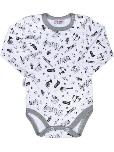 Bavlněné kojenecké body s dlouhým rukávem New Baby Music pro miminka. Body je celopotištěné obrázkem notiček a hudebních nástrojů. Zapínání na cvočky na ramínku a mezi nožičkami. Naše originální a zároveň veselé body je vhodné pro kluky i holčičky. Složení: 100% bavlna. Rozměry: obvod kolem hrudníku cca 48 cm, délka rukávu cca 27 cm, celková délka cca 46 cm.