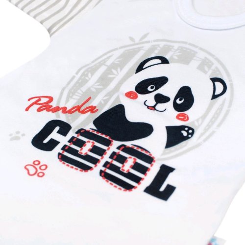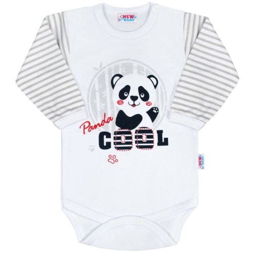 Bavlněné kojenecké body s dlouhým rukávem New Baby Panda pro miminka. Dětské body má rukávky celopotištěné moderními pruhy a přední strana je zdobena obrázkem pohádkové pandy a nápisem COOL. Praktické zapínání na cvočky na ramínku a mezi nožičkami velmi usnadní oblékání a přebalování. Body s moderním designem je vhodné pro holčičky i chlapečky. Složení: 100% bavlna.