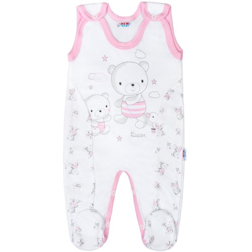 Kojenecké dupačky New Baby Bears. Boky dupaček jsou celopotištěné medvídkami a přední strana je zdobená obrázkem medvídka a nápisem. Zapínání na cvočky na ramínku a mezi nožičkami. Složení: 100% bavlna.