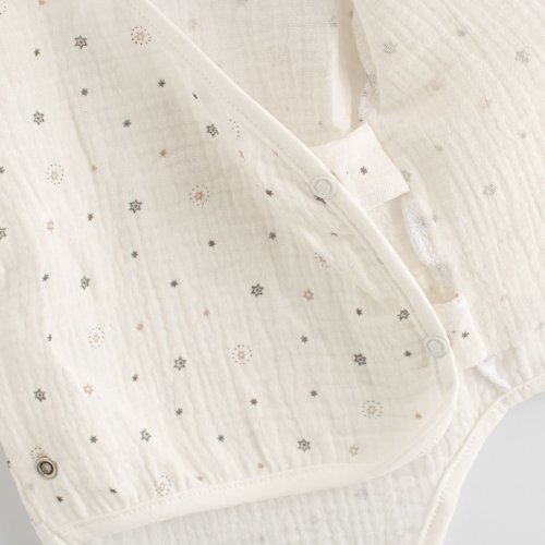 Krásné lehounké body s dlouhým rukávem české značky New Baby Arthur. Mušelínové zavinovací body s dlouhým rukávem ocení miminka díky kvalitnímu materiálu. Zapínání na boku a mezi nožičkama na cvočky. Mušelín je jedna z nejčistších, nejjednodušších a nejjemnějších tkanin na světě. Jemně tkaný prodyšný materiál je tak dokonalý, že si jej zamilují děti po celém světě. Lehká struktura umožňuje mušelínu „dýchat“ a zajišťuje dostatečnou cirkulaci vzduchu, čímž snižuje riziko přehřátí. Tato vlastnost pomáhá udržet Vaše dítě v pohodlí, bezpečí a rodiče v klidu. Mušelín je velmi odolný a to tak, že bez problémů zvládá opakované praní a postupem času je lehčí a jemnější. Složení: 100% bavlna. OEKO-TEX STANDARD 100.
