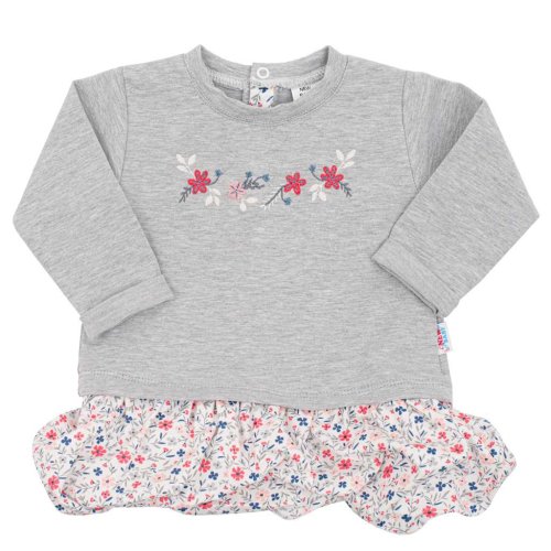 Kojenecké šatičky s dlouhým rukávem české značky New Baby For Girls. Šatičky jsou vhodné na jarní i podzimní období, díky příjemné hrubší vrchní části šatiček. Jsou zdobeny krásnou výšivkou a nařaseným volánkem, který je celopotištěným květinkami. Volánek je ušitý s dvojité látky. Podél celého zapínání na zádičkách je krásný květinkový lem. Moderní střih, květinky, nařasená sukýnka, krásné barvy a neodmyslitelná součást holčičího oblečení. Složení: 89% bavlna, 8% polyester, 3% elastan, volánek: 100% bavlna.