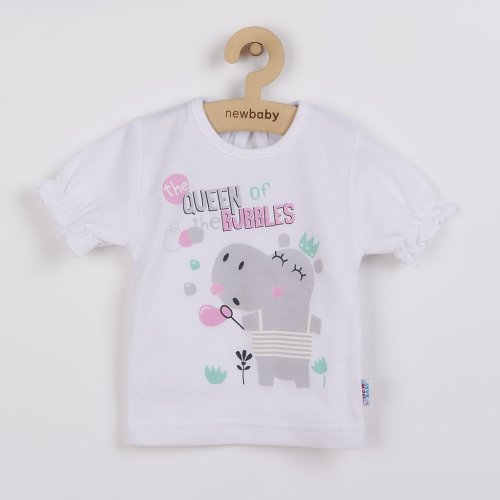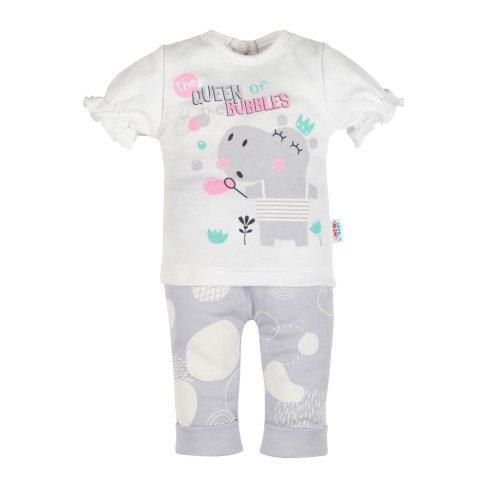 Krásná a veselá letní 2-dílná bavlněná soupravička české značky New Baby Queen. Holčičí soupravička obsahuje tričko a tepláčky. Tričko je zdobeno veselým obrázkem hrošíka a nápisem the Queen of Bubbles s krátkým nařaseným rukávkem s jemnou gumičkou. Tričko má zapínání na zadní straně na cvoček. Tepláčky jsou potištěné zajímavým vzorem, v pase mají širší gumičku a nohavičky jsou ukončené elegantními manžetkami. Super letní hit a užitečný kousek do šatníku malé parádnice. Složení 100% bavlna. Rozměr tričko: obvod kolem hrudníku cca 44 cm, délka rukávu cca 11 cm, celková délka cca 30 cm. Tepláčky: obvod kolem pasu cca 42 cm, délka od rozkroku cca 15 cm, celková délka cca 32 cm.