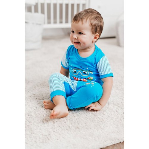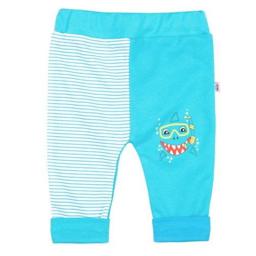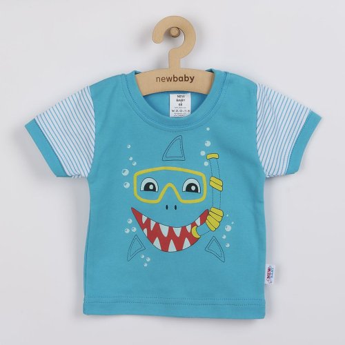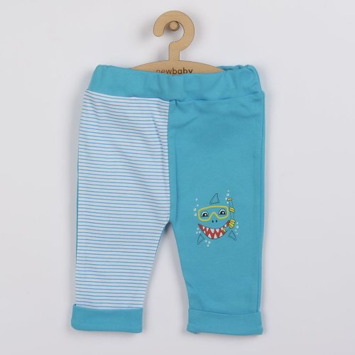 2-dílná bavlněná soupravička české značky New Baby Shark. Soupravička obsahuje tričko a tepláčky. Tričko s krátkým rukávem s módnim prožkovaným potiskem je zdobeno veselým obrázkem žraloka. Tričko je bez zapínání a na krčku má pružný lem pro snadné oblékání. Tepláčky zdobí obrázek žraloka a stále moderní prožky. V pase mají širší gumičku a nohavičky jsou ukončené manžetkami. Tepláčky hravě nahradí kalhoty či rifle. Super letní hit a užitečný kousek do šatníku malých dětí. Složení 100% bavlna.