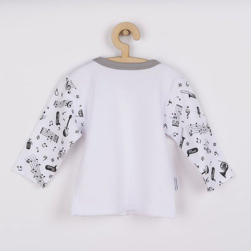 Bavlněný kojenecký kabátek New Baby Music pro miminka. Kabátek je jednobarevný a rukávky jsou celopotištěné notičkami a hudebními nástroji. Zapínání na cvočky po celé délce. Náš hravý kabátek je vhodný pro kluky i holčičky. Složení: 100% bavlna. Rozměry: obvod kolem hrudníku cca 46 cm, délka rukávu cca 22 cm, celková délka cca 29 cm.