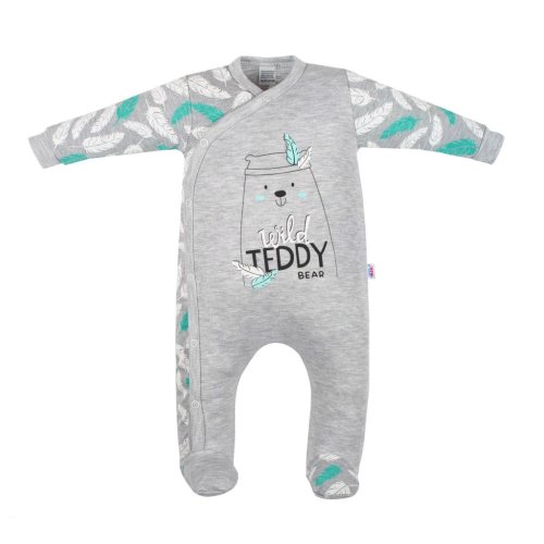 Bavlněný kojenecký overal české značky New Baby Wild Teddy pro miminka. Overálek má rukávky potištěné krásnými pírky, které jsou bezpochyby trendy. Přední část zdobí obrázek medvídka a nápis wild Teddy Bear. Moderní boční zapínání na cvočky po celé délce usnadňuje oblékání a přebalování. Složení: 100% bavlna.