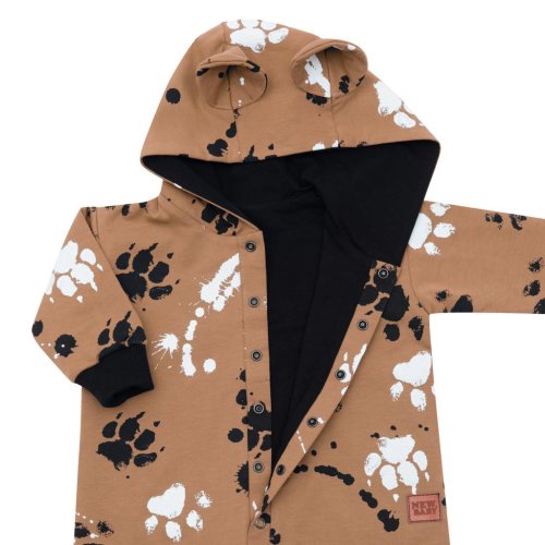 Nápaditý bavlněný kojenecký overal české značky New Baby Paw. Overal je celopotištěný dětským vzorem. Je vyroben z kvalitního bavlněného materiálu s elastanem a bavlněnou podšívkou. Materiál je hladký a příjemný na dotek. Praktické zapínání na cvočky po celé délce velmi usnadní oblékání a přebalování. Overal má praktickou kapuci s oušky, širší pružné lemy na rukách a nohavičkách a celá vnitřní strana je zateplená bavlněnou podšívkou, která zvyšuje komfort nošení. Miminko se bude cítit v overálku velmi pohodlně a příjemně. Složení: 95% bavlna, 5% elastan, podšívka- 95% bavlna, 5% elastan. Vhodné na jaro a na podzim.