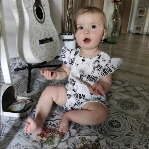 Letní bavlněný overal s krátkým volánkovým rukávem české značky New Baby Paris. Overal zdobí potisk s motivem Paris a roztomilé volánkové rukávky. Má praktické zapínání na cvočky na ramínku a mezi nožičkama, což usnadní oblékání a přebalování. Pěkný letní motiv rozzáří všechny holčičky. Složení: 100% bavlna.