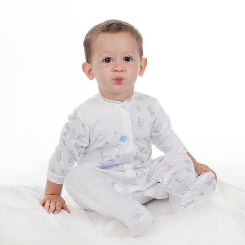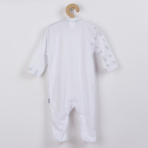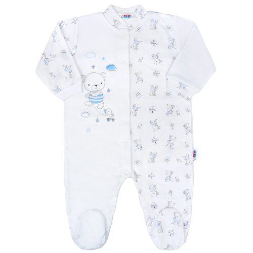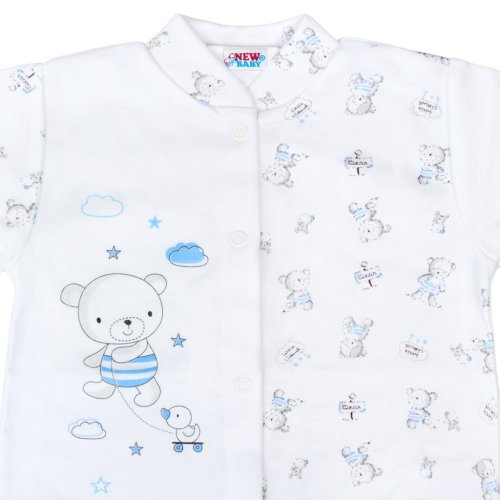 Kojenecký overal s dlouhým rukávem New Baby Bears. Overal je celopotištěný medvídkami a přední strana je zdobena obrázkem medvídka. Zapínání na cvočky po celé délce a mezi nožičkami. Složení: 100% bavlna.