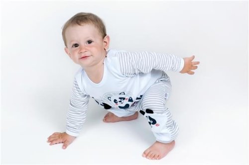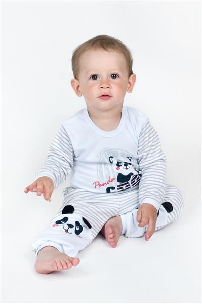 Bavlněný kojenecký overal New Baby Panda pro miminka. Overal je proužkovaný a zdobený obrázkem pandy a nápisem COOL. Na tlapkách je hlavička pandy a 3D ouška. Praktické zapínání na cvočky po celé délce a mezi nožičkami. Overal s moderním designem je vhodný pro holčičky i chlapečky. Složení: 100% bavlna.