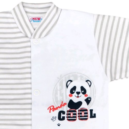 Bavlněný kojenecký overal New Baby Panda pro miminka. Overal je proužkovaný a zdobený obrázkem pandy a nápisem COOL. Na tlapkách je hlavička pandy a 3D ouška. Praktické zapínání na cvočky po celé délce a mezi nožičkami. Overal s moderním designem je vhodný pro holčičky i chlapečky. Složení: 100% bavlna.