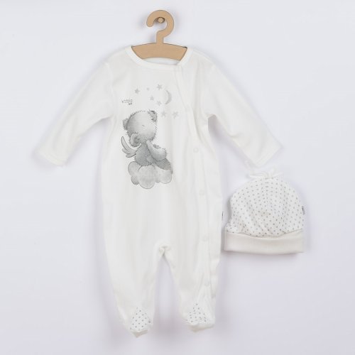 Okouzlující a jemný bavlněný kojenecký overálek s čepičkou Koala Angel. Overálek má moderní boční zapínání na cvočky po celé délce a mezi nožičkami. Je vhodný pro miminka už od narození pro svou jemnost a měkkost. Overal je zdoben obrázkem medvídka. Čepička s širším lemem krásně kryje ouška a je celopotištěná puntíky. Overal s čepičkou je vyroben z příjemného a kvalitního bavlněného materiálu, ve kterém se bude Vaše miminko cítit příjemně. Složení: 100% bavlna.