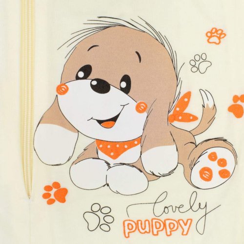 Bavlněný kojenecký spací pytel New Baby pro miminka v krásné pastelové barvě s veselým obrázkem pejska. Spací pytel je vhodný pro miminka už od narození pro svou jemnost a měkkost. Praktické zapínání na zip po celé délce. Složení: 100% bavlna.